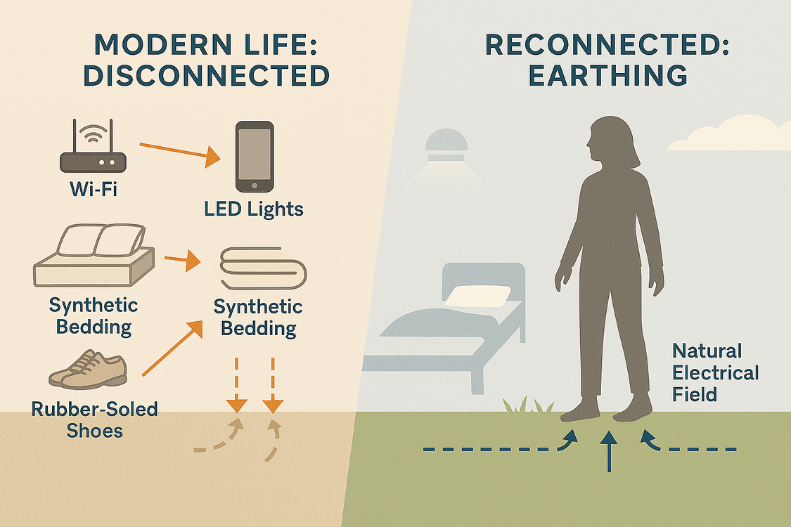 Modern life keeps us electrically disconnected — rubber soles, upstairs bedrooms, synthetic mattresses, Wi-Fi, and EMFs all break our natural link with the Earth.